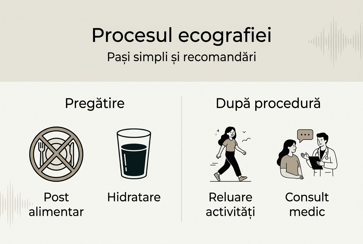 | Pregătire variabilă | Depinde de tipul ecografiei, putând include post alimentar sau hidratare |
