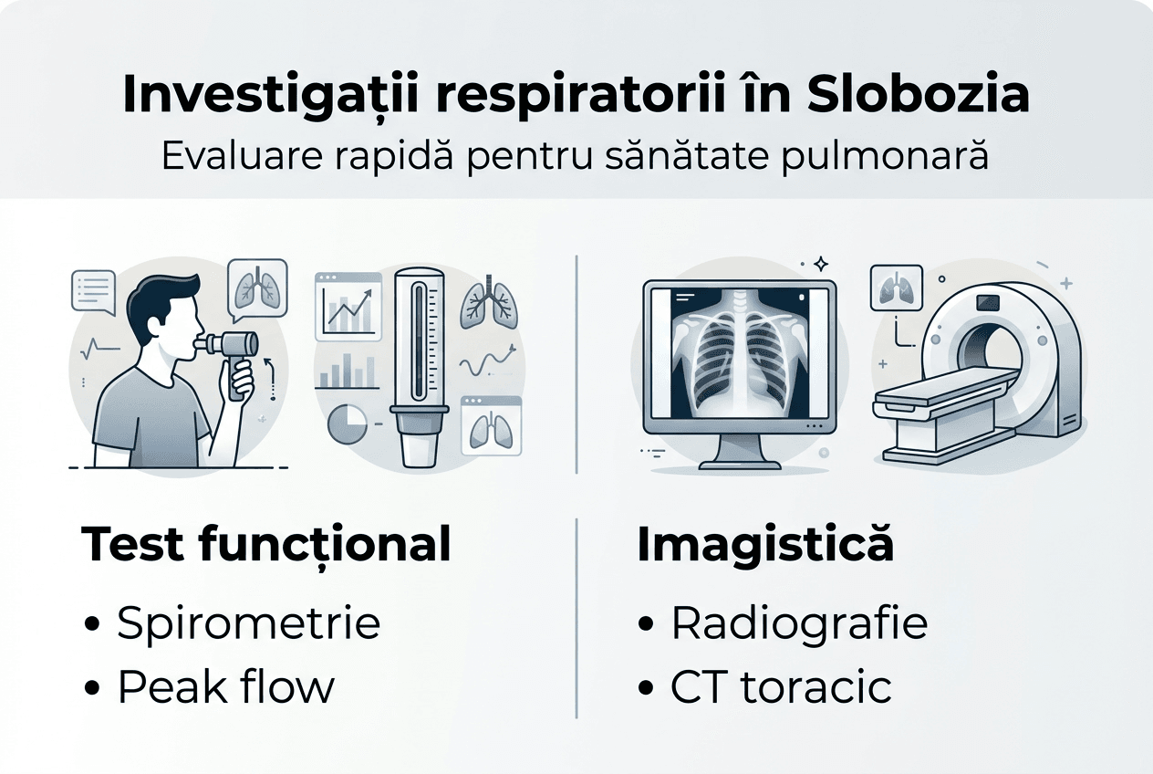 Clinicile moderne din Slobozia oferă spirometrie pentru evaluarea funcției pulmonare, radiografie toracică digitală, teste de alergie cutanată și oximetrie de puls. Investigații mai complexe precum bronhoscopia sau tomografia computerizată toracică sunt disponibile în funcție de dotările specifice ale fiecărei clinici. Servicii pneumologie detalii oferă informații complete despre gama de teste disponibile.